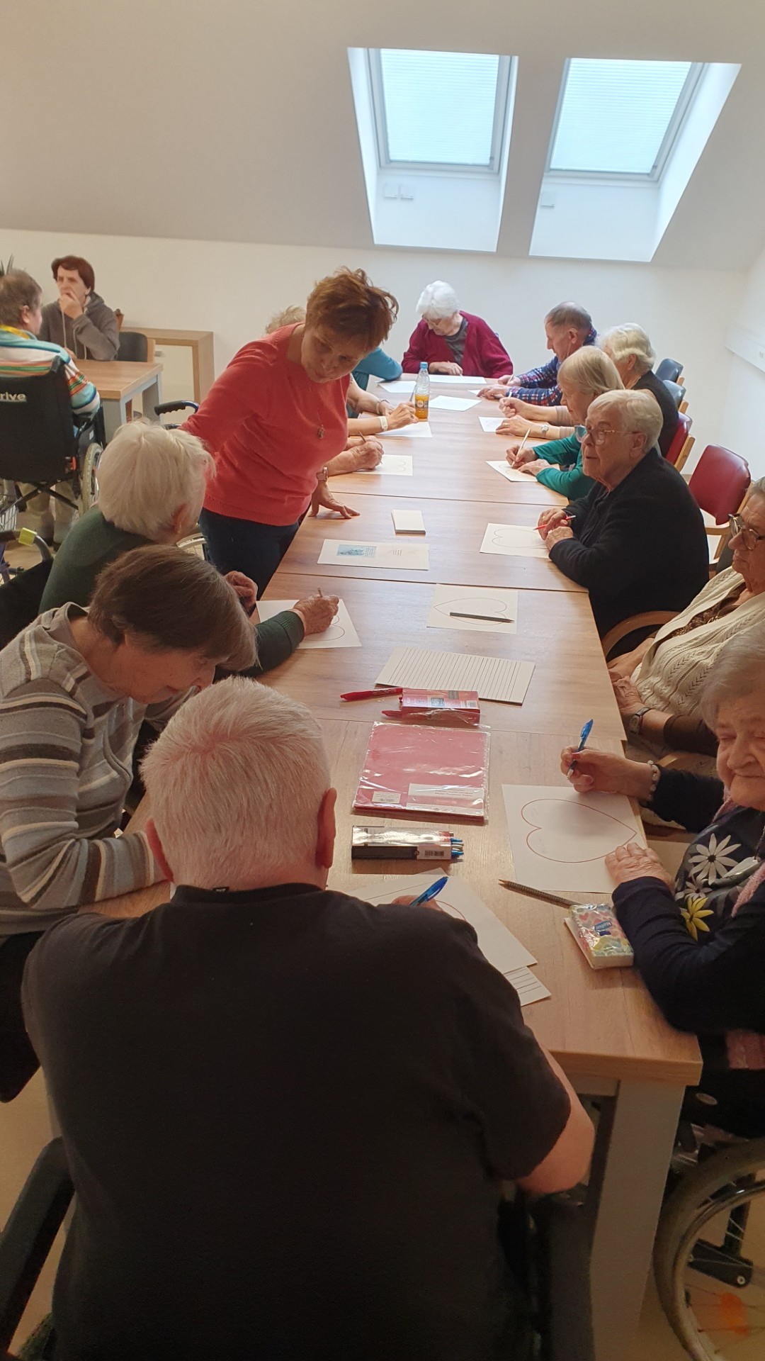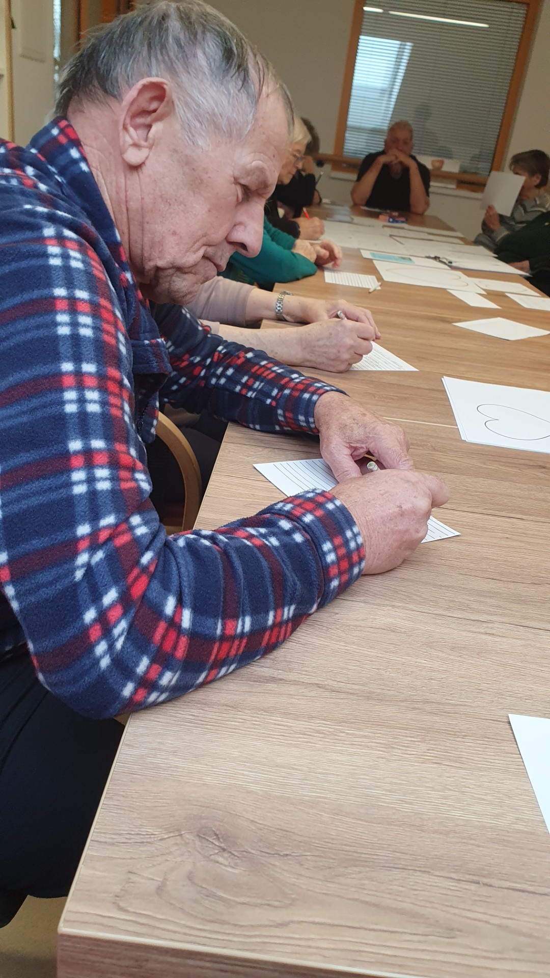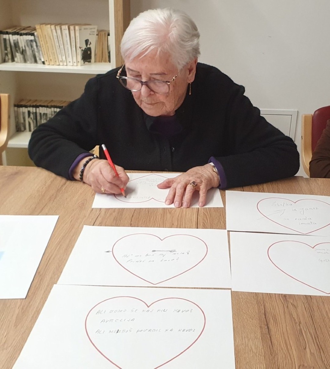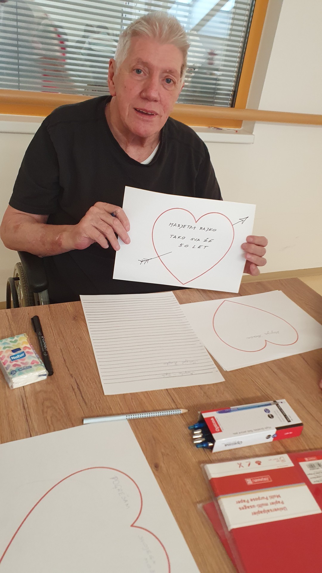 "Humor je najboljše črnilo" je osrednja tema letošnjega meseca pisanja z roko. Skupaj z učiteljico OŠ Kidričevo ga. Senko so stanovalci zapisali zaljubljena in prijazna sporočila, nato so razmišljali še o humornih pregovorih in šalah. Stanovalcem gre pisanje z roko brez težav, predvsem so se prijetno nasmejali šalam.
