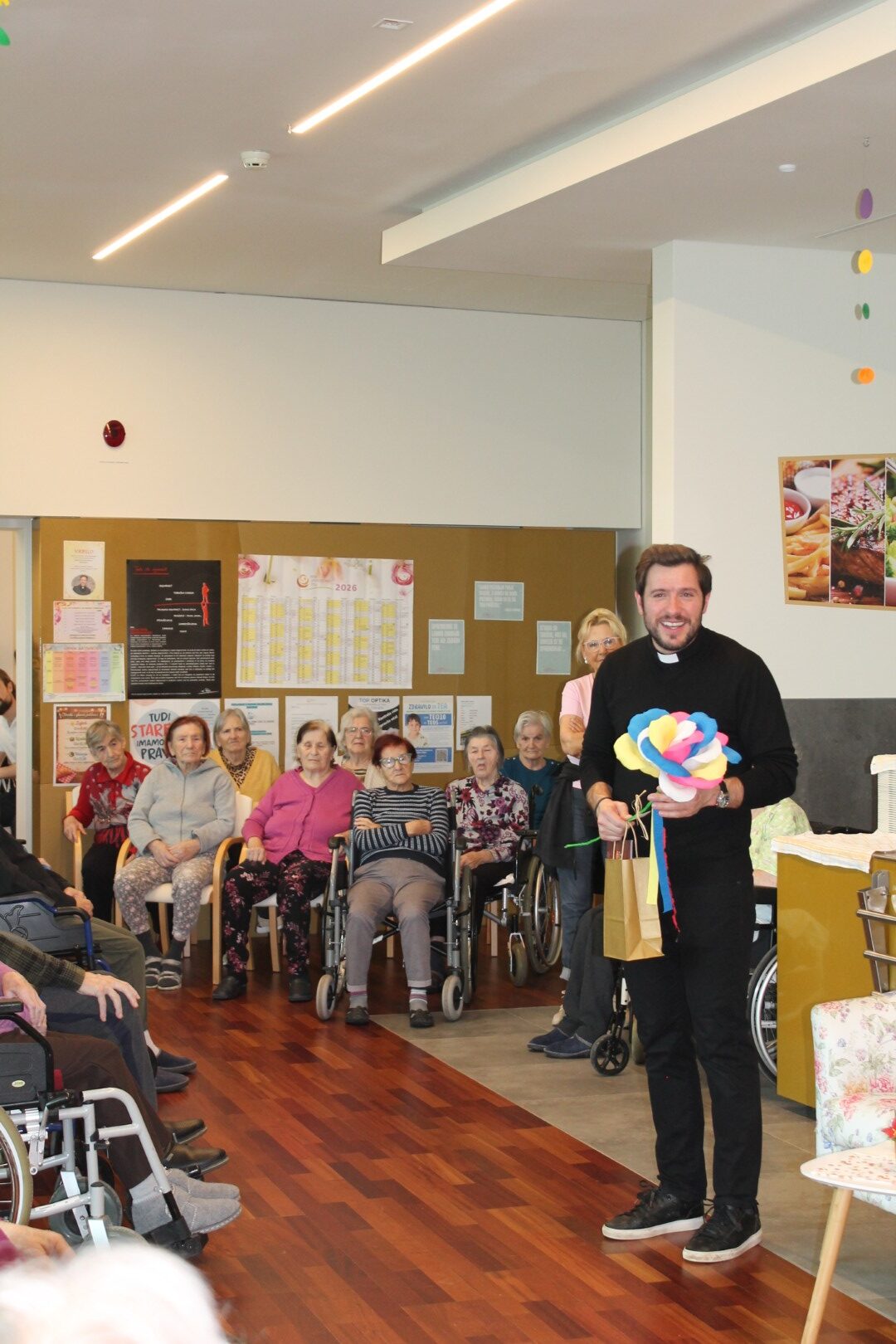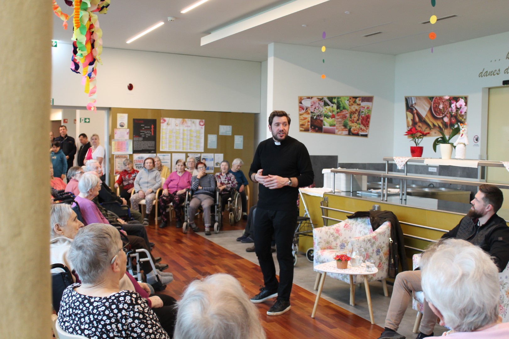 S svojim obiskom nas je počastil župnik, gospod Martin Golob. V sproščenem pogovoru je spregovoril o duhovniškem življenju in o svojem poslanstvu. Nasmejal nas je z anekdotami in nas navdušil s svojim preprostim pogledom na življenje. Predstavil je svoj pogled na starost ter opisal lastno sodelovanje in sprejemanje starejših. Poudaril je, da so za zdravo delovanje skupnosti pomembni vsi njeni člani, od najmlajših do najstarejših. Stanovalcem je svetoval, naj se nikoli ne počutijo odvečne ali breme družbi in jim namenil blagoslov. Kot popotnico jim je zaželel, naj jim ne zmanjka volje do življenja ter naj vsak dan živijo čim bolj polno, saj se morajo zavedati, da je tudi starost dar, ki ni poklonjen vsakomur. S svojo ljudskostjo in prijaznostjo se je prikupil prav vsem stanovalcem in vsi so pritrdili, da je čas druženja z njim prehitro minil.