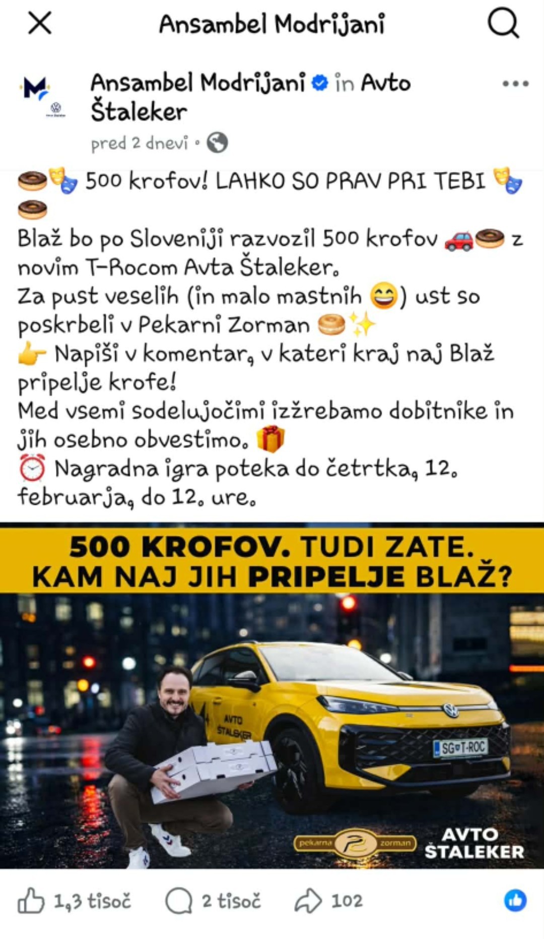Kidričevo admin torek, 24. februarja 2026 Posebni krofi (13.2.2026) Sodelavka Tamara je sodelovala v nagradni igri ansambla Modrijani, Avtohiše Štaleker in Pekarne Zorjan. In... Blaž Švab nam je krofe dostavil v petek 13. februarja.
