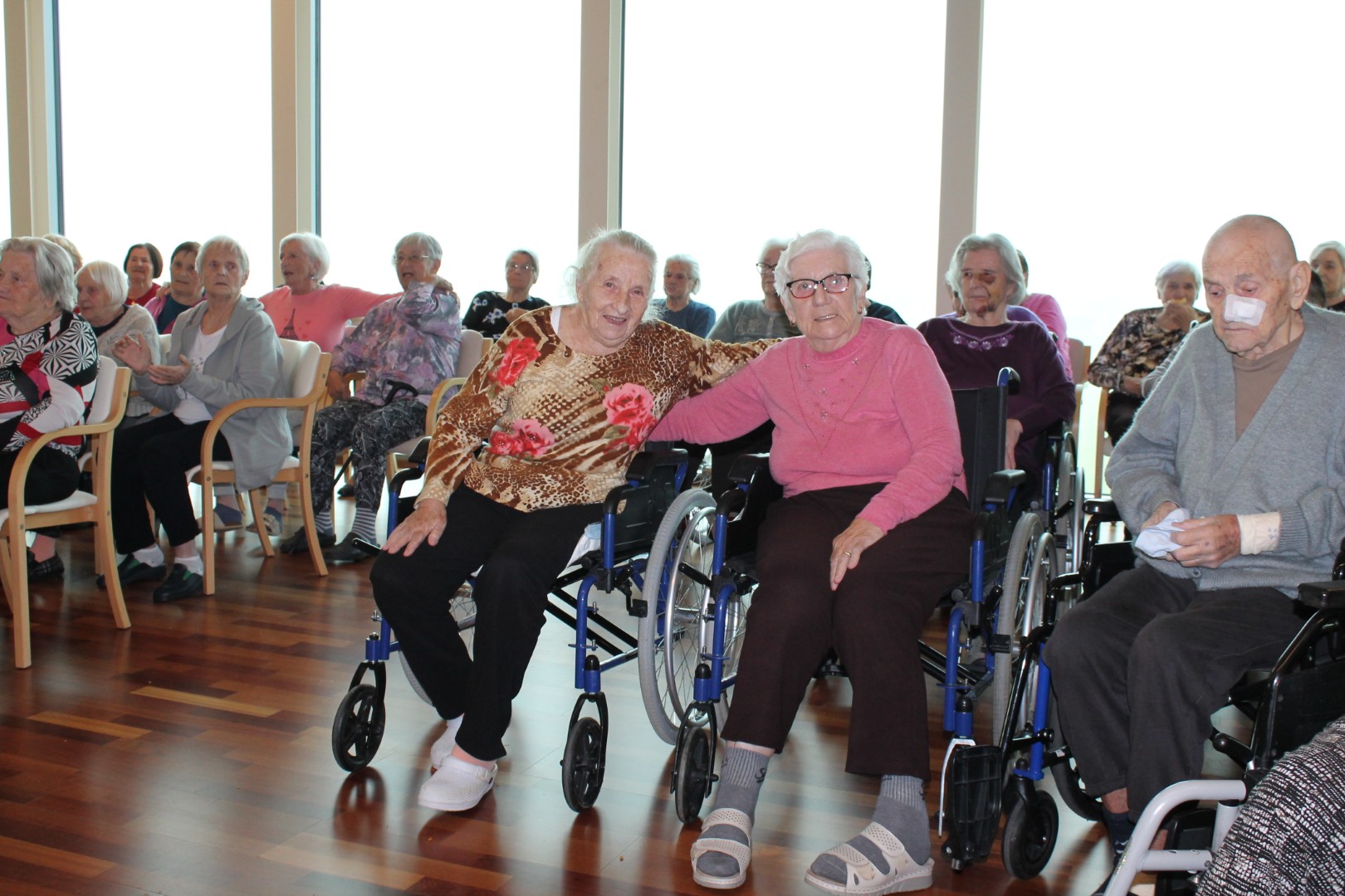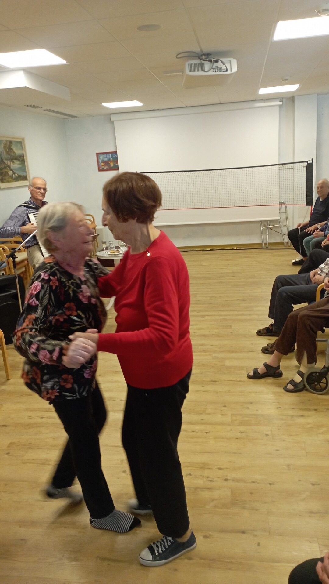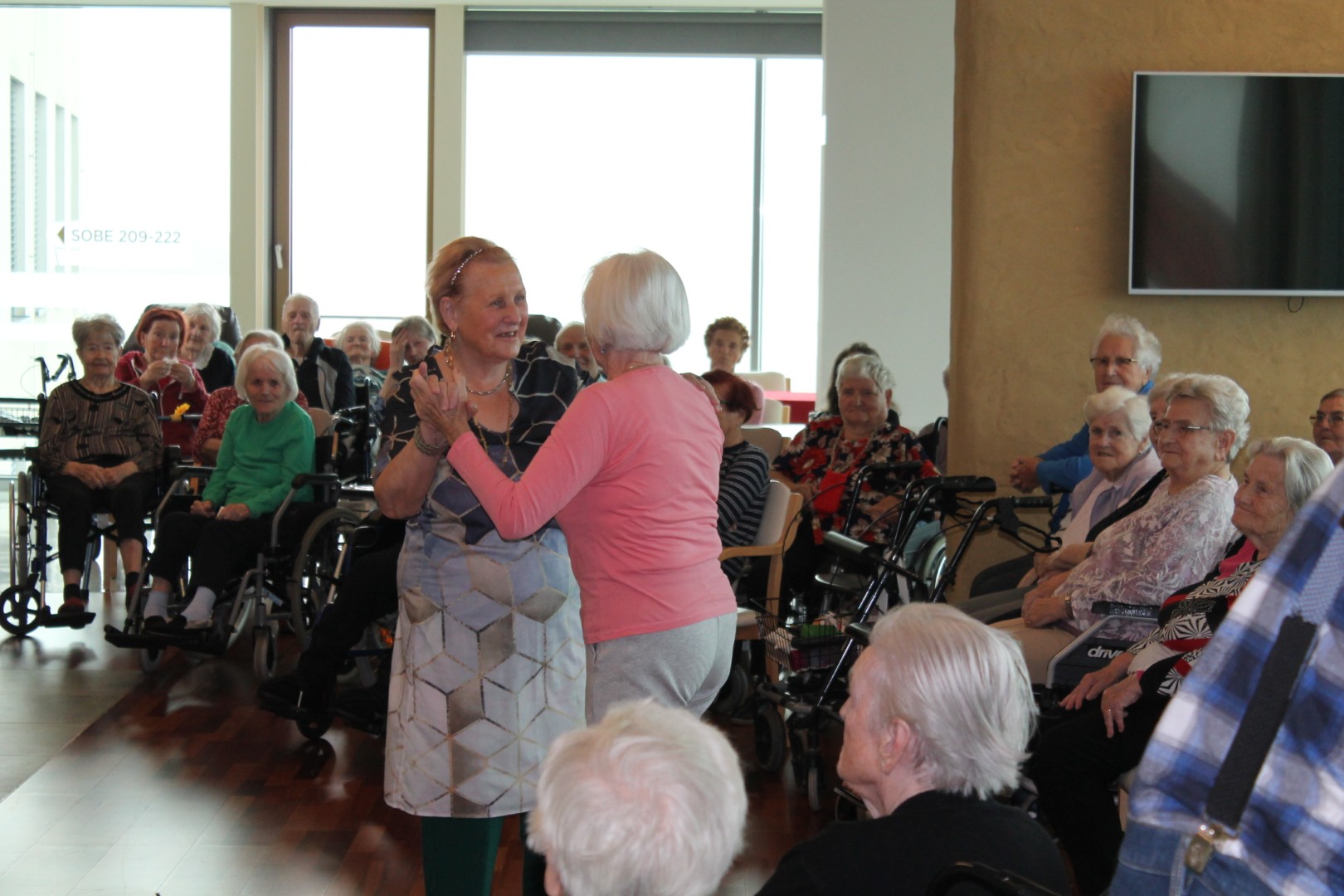 Ponovno smo plesali in prepevali ob zvokih harmonike našega muzikanta gospoda Janka. Vsak zadnji četrtek v mesecu imamo v enoti veselico, kot smo ta druženja poimenovali. Žena stanovalca mi je povedala: »Sem si označila na koledar, da ne bom pozabila priti. Z možem sva vedno rada plesala. Prva sva šla na plesišče in zadnja dol. Pridem, da zapleševa, dokler se bo še dalo.« Plesali smo skoraj vsi. Razvilo se je prav prijetno vzdušje. Veselimo se že zadnjega četrtka v novembru.