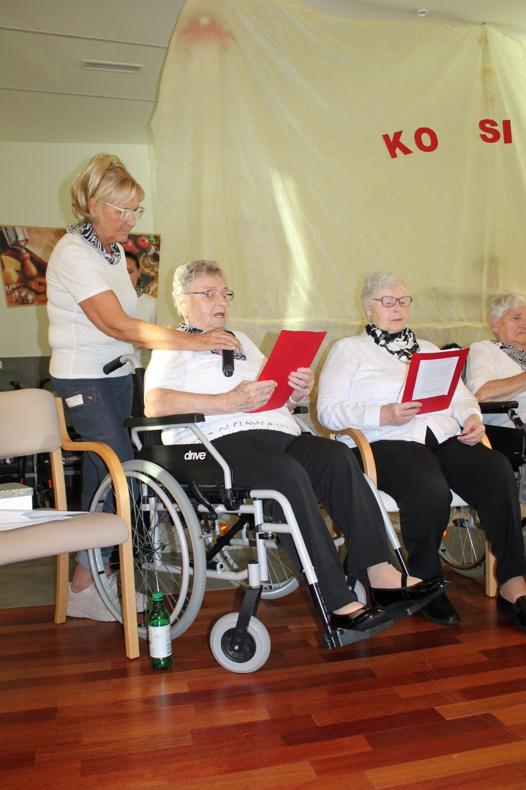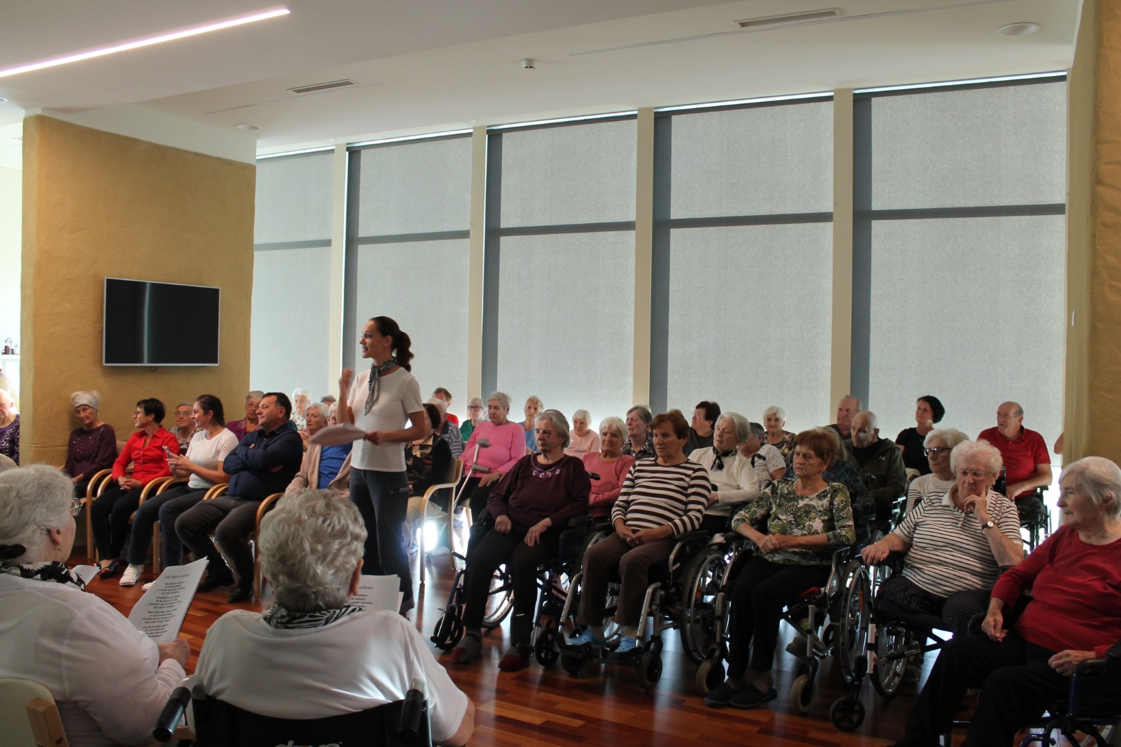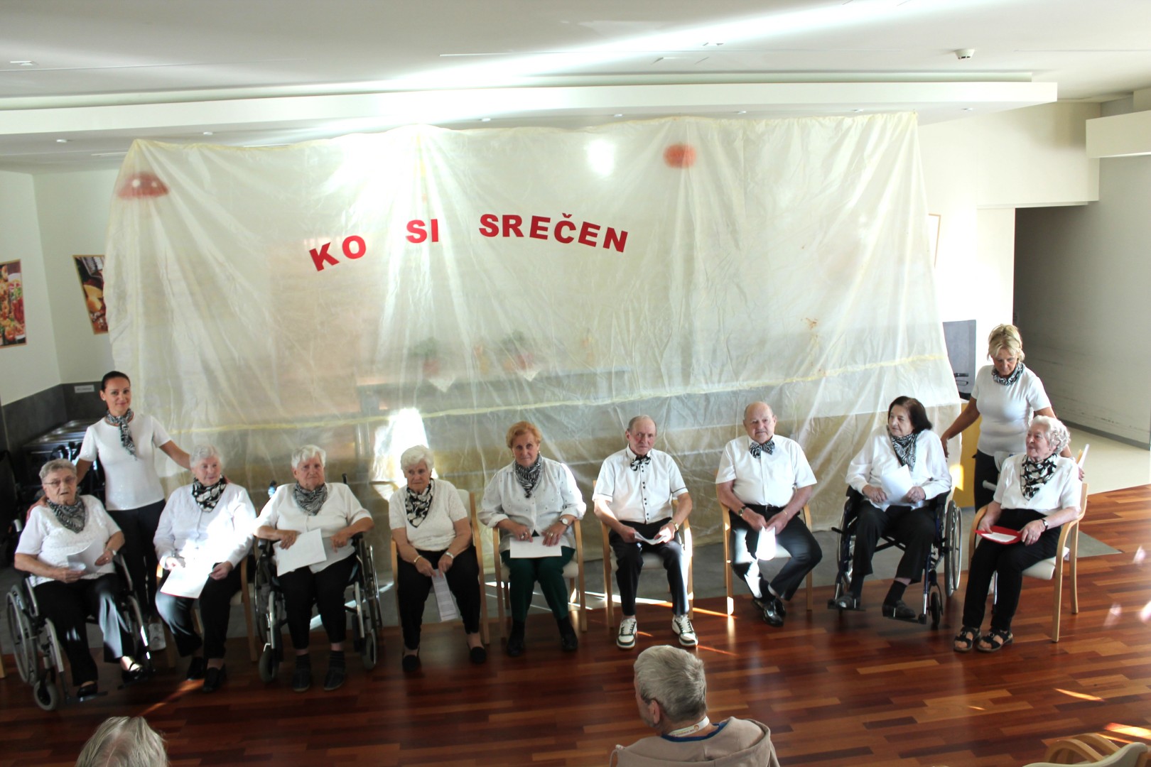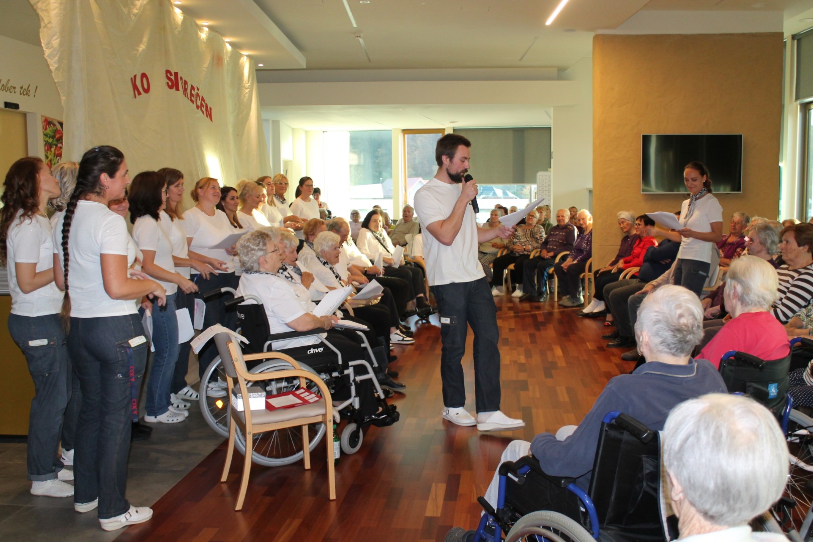 Stanovalci pevske in bralne skupine so pod vodstvom varuhinj Ive in Vesne pripravili čudovit, že tradicionalni pevsko- bralni koncert, ki je nosil naslov: Ko si srečen. Tokrat se jim je na odru pridružil tudi zbor zaposlenih.