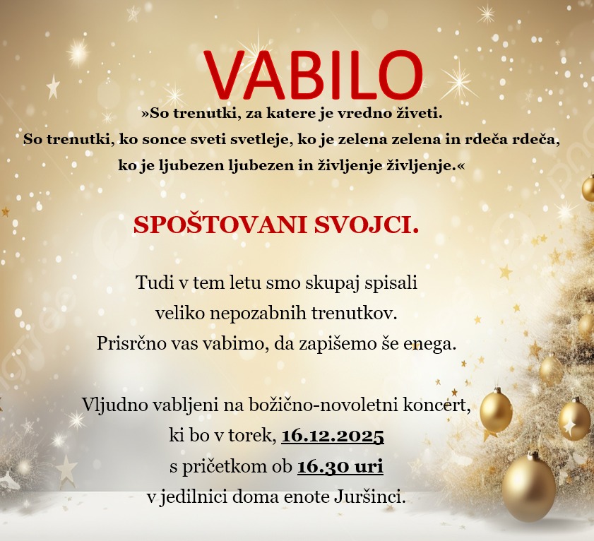Vljudno vabljeni na božično-novoletni koncert, ki bo v torek, 16.12.2025 s pričetkom ob 16.30 uri v jedilnici doma enote Juršinci.