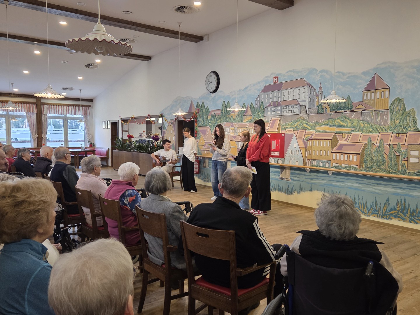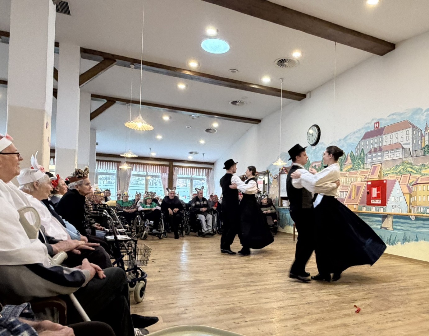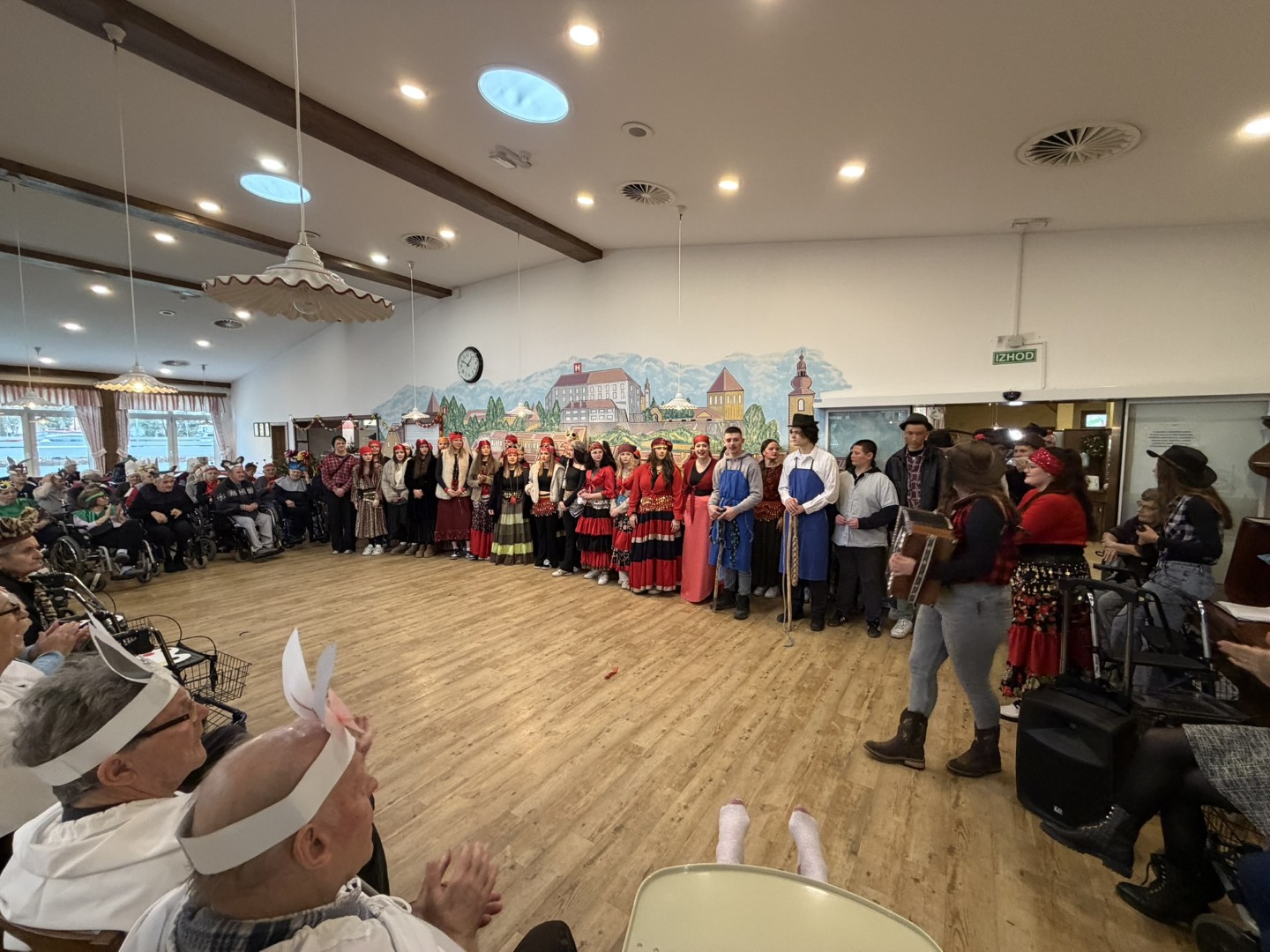 V sredo, 11. 2. 2026, so nam dijaki Srednje šole za ekonomijo, turizem in kmetijstvo pripravili veselo pustno rajanje. Predstavili so se z nekaterimi najbolj prepoznavnimi pustnimi liki – kurenti, pokači, meliko, cigani in krampusom. S pisanimi kostumi, glasnim rajanjem in dobro voljo so pričarali pravo pustno vzdušje. Za še bolj živahno dogajanje so poskrbeli štirje plesalci folklorne skupine. Spremljali so jih zvoki harmonike in petje, ki sta dogodek še dodatno obogatila. Dogajanje je bilo razigrano in polno energije, stanovalci pa smo v pestrem programu zelo uživali.