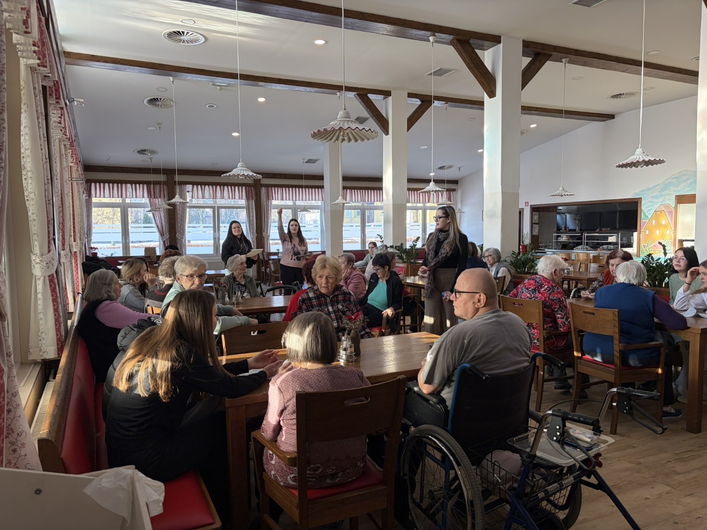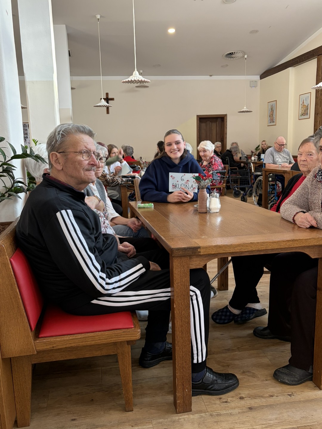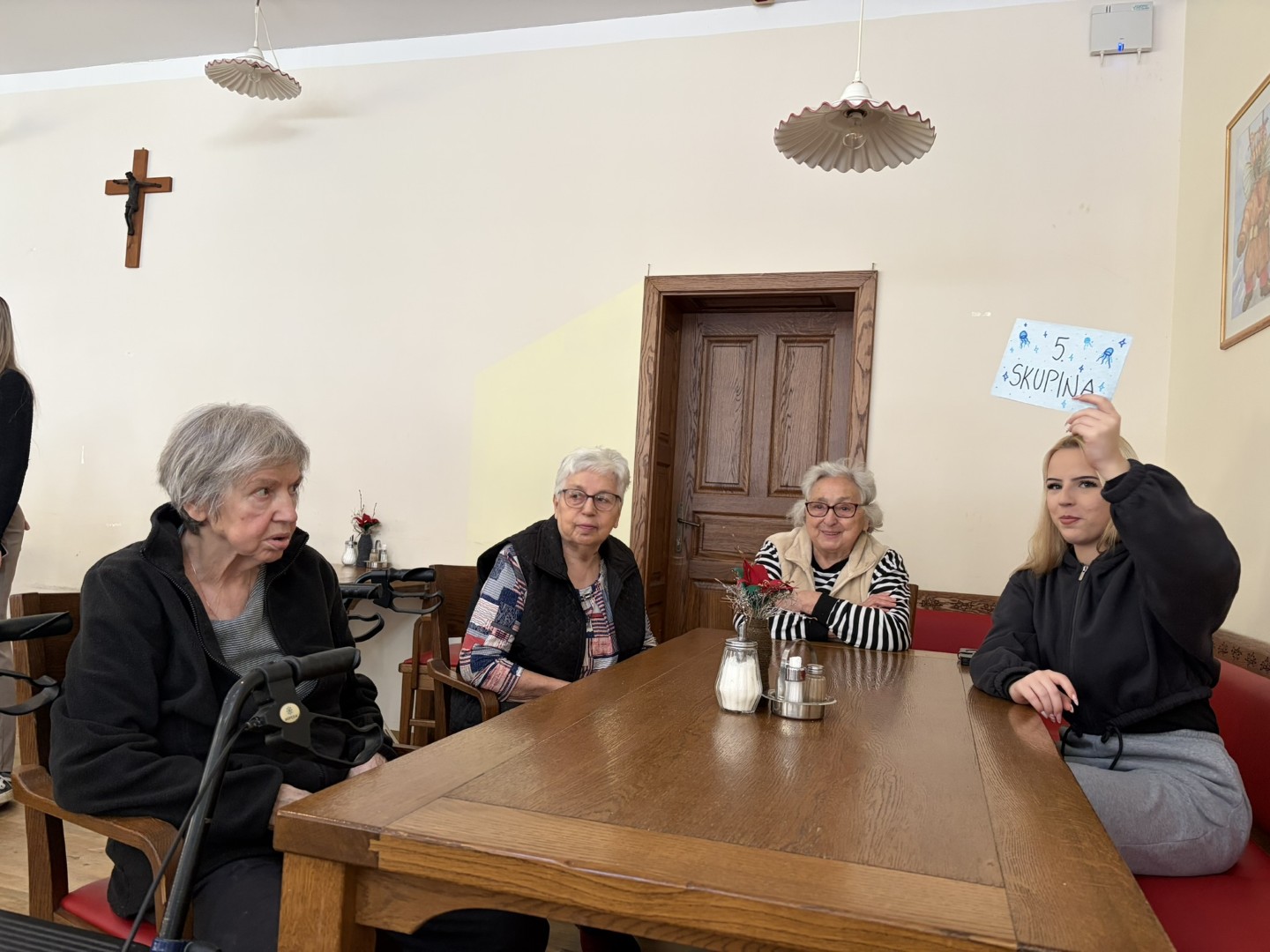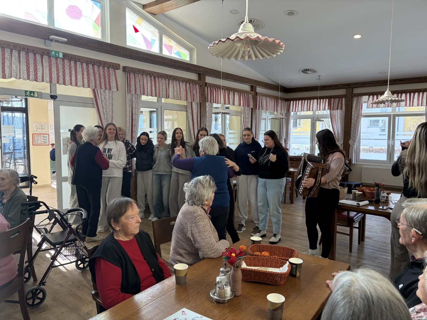 Sredino dopoldne smo rezervirali za trening možganov. Dijaki šole za ekonomijo, turizem in kmetijstvo Ptuj so nam pripravili kviz o slovenskih pregovorih. Za sladko razvajanje so s seboj prinesli tudi jabolčni sok, ki ga proizvajajo dijaki sami. Druženje so popestrili s petjem in plesom ob spremstvu harmonike. V znak zahvale za skrbno pripravljen dogodek in prijetno druženje pa je naša stanovalka dijakom z recitacijo svoje pesmi o mladosti polepšala zaključek srečanja.