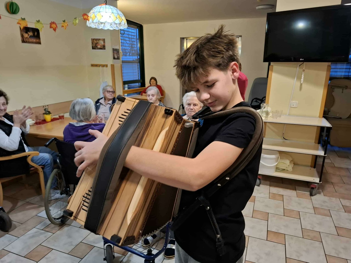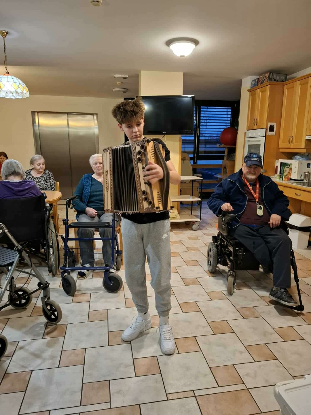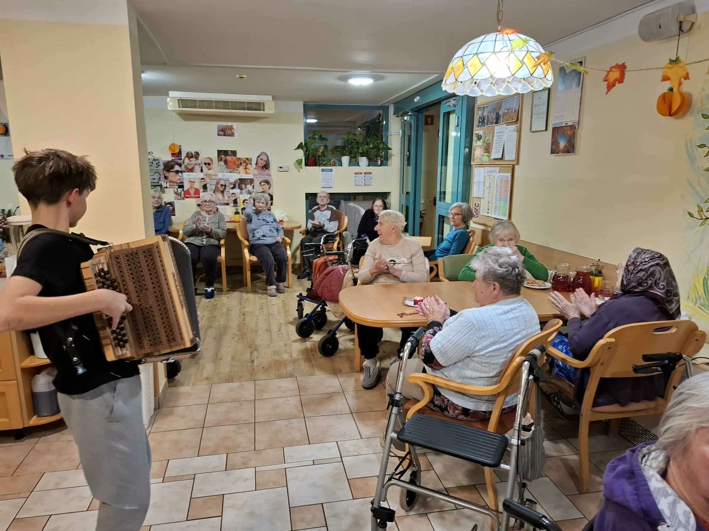 Tokrat nas je obiskal mladi fant harmonikaš Val. S svojo harmoniko nam je zaigral nekaj melodij ter s svojo mladostno energijo in glasbo polepšal dan. Njegov obisk je med stanovalce prinesel nasmeh, dobro voljo in prijetno vzdušje.